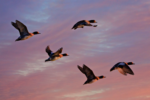 암컷이 알을 품으면 수컷은 암컷을 떠난다고 했는데요. 이때 수컷들은 한데 모여 털갈이를 한답니다. 털갈이를 하는 동안에는 깃털이 빠지기 때문에 수컷은 한동안 날지 못합니다. 초가을이 되서야 밝은 색의 깃털을 되찾습니다. 암컷은 알이 부화하면 털갈이를 시작해서 깃털을 전부 교체합니다. 깃털이 모두 자라고, 새끼들이 날 수 있게 되면 오리는 무리를 지어 월동지로 이동합니다. 이들은 보통 길게 한 줄로 비행하거나 V자 모양으로 비행합니다. 겨울을 나기 위해 남쪽으로 몃백 Km에 이르는 먼 거리를 이동하는 종류도 있지만 짧은 거리만 이동하는 종류도 있습니다.